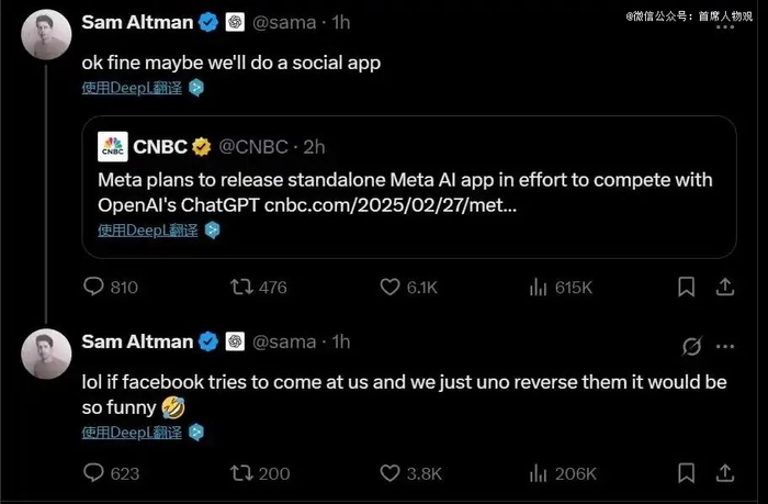 今年2月28日,CNBC报道称,Meta旗下的AI助手Meta AI即将成为该社交媒体公司的独立应用,目标直指OpenAI和谷歌母公司Alphabet等竞争对手。对此,OpenAI奥特曼回应道:“要不我们去做一款社交APP?”并在社交媒体的评论区写道,“如果Facebook想找我们麻烦,我们直接‘反杀’他们,那场面一定超搞笑。”