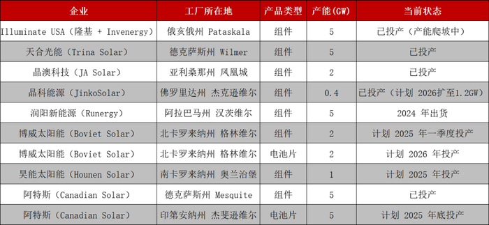 中企在美产能布局呈现出“组件为主、电池跟进、硅片稀缺”的特点。