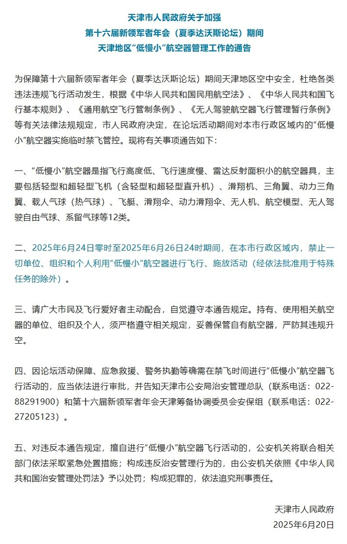 央视网消息:据“天津发布”微信公众号消息,为保障第十六届新领军者年会(夏季达沃斯论坛)期间天津地区空中安全,杜绝各类违法违规飞行活动发生,根据《中华人民共和国民用航空法》、《中华人民共和国飞行基本规则》、《通用航空飞行管制条例》、《无人驾驶航空器飞行管理暂行条例》等有关法律法规规定,天津市人民政府决定,在论坛活动期间对天津市行政区域内的“低慢小”航空器实施临时禁飞管控。
