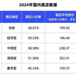 RevPAR(单间可售房间的收入)方面,华住集团2025年一季度财报,其RevPAR为208元/晚,同比下降4%,创2023年疫情恢复以来新低。2024年,国内酒店业的平均房价有所回落,整体RevPAR为118元,同比下降9.7%。