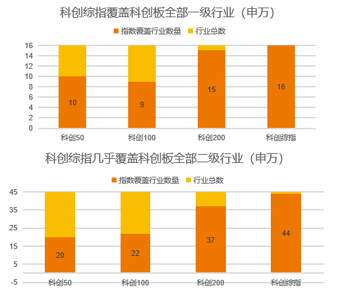 行业分布方面,科创综指覆盖科创板上市的全部 16 个一级行业,覆盖 44 个二级行业,覆盖度达 96%,均超过科创 50、科创 100 和科创 200。