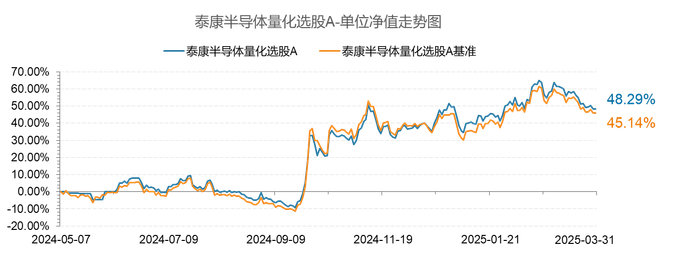 其在管的量化产品——泰康半导体量化选股基金,A类份额自成立以来累计绝对收益48.29%,同期业绩比较基准收益率45.14%,相对基准收益3.15%(数据来源:基金25年1季报,统计截至2025.03.31)。