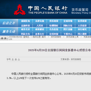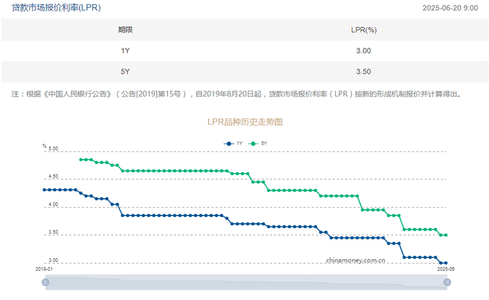 6月20日,中国人民银行授权全国银行间同业拆借中心公布,2025年6月20日贷款市场报价利率(LPR)为:1年期LPR为3.0%,5年期以上LPR为3.5%。以上LPR在下一次发布LPR之前有效。