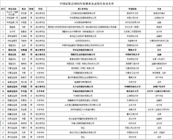 通过对中国证监会2025年度拟录用公务员名单的分析,可总结出以下关键特征及趋势: