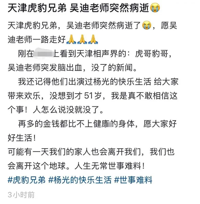 相声圈又传噩耗!著名双胞胎相声演员 “虎哥” 吴迪因病离世,年仅51岁。