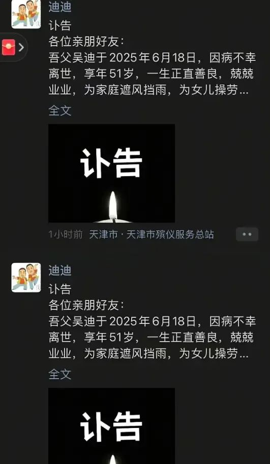 6月19日晚,有网友晒出天津相声演员吴迪离世的讣告,从内容看讣告是吴迪的女儿发布的,内容如下: