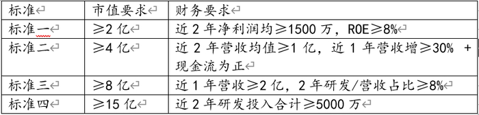 适用VIE或境外注册主体,财务标准同标准1,额外要求 行业符合国家战略(如科技、能源)。