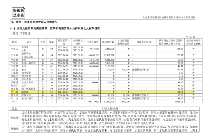 李裕高先生,中国国籍,无境外永久居留权,1968年8月出生,中级工程师,曾在上海交通大学EMBA研究生班就读。历任温州水星被服有限公司副总经理,上海水星被服有限公司副总经理,上海水星家用纺织品有限公司副总经理,上海水星家用纺织品有限公司董事兼副总经理,江苏叠商置业有限公司副董事长。现任公司董事兼副总裁,水星控股集团有限公司董事,南通水星电动工具有限公司董事,江苏水星家用纺织品有限公司监事。