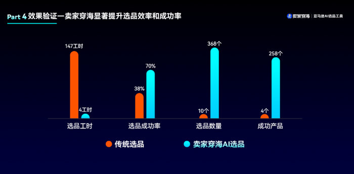 这套解决方案验证下来,对跨境卖家的选品效率和成功率的提升,效果非常明显。根据市场调研数据,对比传统选好一款产品所需的147个工时,使用卖家穿海工具选品只需4个工时;节约了时间的同时,成功率由38%提升到70%。这也就意味着,同样的时间和条件下,传统方式只能选10个产品,且只有不到4个产品能成功,而卖家穿海的用户可以选出368个产品,并且有差不多258款产品获得成功。两种选品方式无疑产生了巨大的差距。如果再把时间拉长一点,差距只会越来越大。