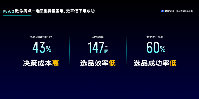 据调查:成功卖家在选品阶段投入的决策时间占比高达43%,远超运营优化和广告投放等环节的所用时间。过去人工挑选一款产品,至少需要经历12个环节、平均消耗147工时。如此大量的投入,所带来的回报却不尽人意,数据显示,平均新品死亡率还是高达60%。