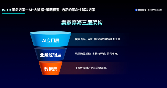 Jason介绍了公司研发的跨境电商行业首个选品运营AI SaaS解决方案——卖家穿海Seascross。该方案采用三层架构体系,包括数据层、业务逻辑层和应用层,实现了全链路数字化赋能。结合Deepseek等先进AI技术和十多年跨境电商行业商业理解,卖家穿海能够理解用户输入的选品需求,运用逻辑推理进行任务分解,并自动调用数据库、API等资源,最终给出高效的选品结果。AI策略化选品、AI对话式选品、AI锚点选品、AI选品调研报告、AI评论分析等创新功能大大简化了选品流程,提高了选品效率和成功率。另外,Jason还表示,卖家穿海的服务并不止于选品,而是提供一站式服务,从关键词、listing优化、类目和价格差异化、买家评论分析、广告穿透分析等多个维度帮助打造产品,还可以一键算利润、查专利、找货源等全方位解决方案,助力卖家在跨境电商链条上的各个环节实现全面提升。