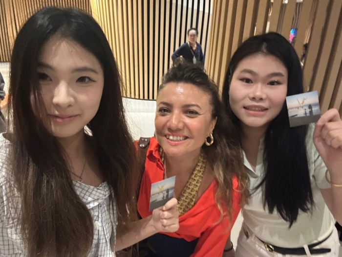 杨雨洁和朋友与《白天是阿波罗 晚上是雅典娜》制片人拿着自制物料合影