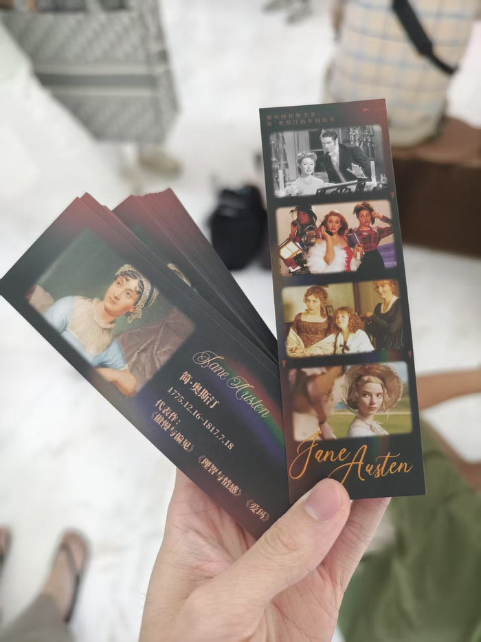 从去年年底上海国际电影节发布将纪念简·奥斯汀诞辰250周年的特别策划开始,蔚然就决定了今年的物料制作主题——票根书签。书签的纤巧雅致与简・奥斯汀作家的身份,以及喜欢简·奥斯汀的影迷画像高度契合,蔚然选取了影展单元中的四部影片《傲慢与偏见》《独领风骚》《理智与情感》《爱玛》中的经典剧照共同组成一张书签。“我想简·奥斯汀的影迷,一定会想要拥有一张优秀的书签。”