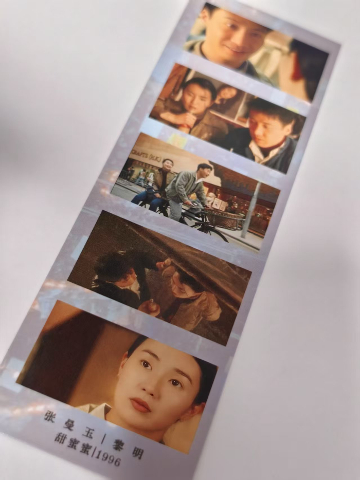 “《甜蜜蜜》必不可少就是他们俩骑着自行车的画面,我把它放在了书签的c位,背面是他们俩经典车窗吻的画面。相信影迷朋友也都很喜欢这些瞬间。”