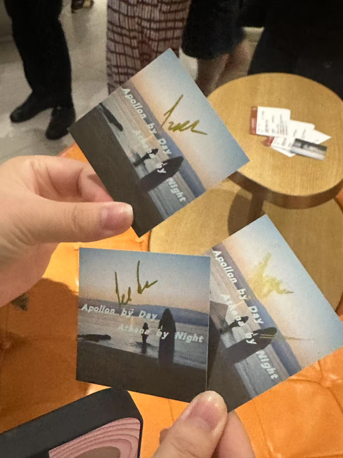 《白天是阿波罗 晚上是雅典娜》作为一部新片,全网图片资料非常少,她就选取了主海报和一张剧照做了方卡,“是非常有氛围感的两个画面。”在放映当日,她的物料上还获得了该片制片人的亲笔签名。