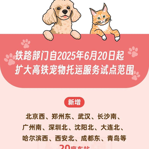 为更好满足旅客携宠出行的需求,铁路部门自2025年6月20日起扩大高铁宠物托运服务试点范围,覆盖京沪、京广、京哈、沪昆等8条高铁的25座车站、38趟动车组列车,旅客可同车托运1只家庭驯养且健康状况良好、单只体重不超过15公斤、肩高不超过40厘米的猫、犬类宠物。