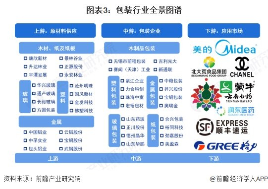 包装行业上游原材料及包装设备行业中,通用塑料行业代表企业有金发科技、沃特新材料、国恩科技等,包装用纸行业代表企业有玖龙纸业、理文造纸、太阳纸业和山鹰纸业等,包装玻璃行业代表企业有山东药玻、正川股份、旗滨集团等;中游包装行业纸质包装行业代表企业有上峰集团、利乐包装、锦胜包装等,金属包装行业代表企业有中粮包装、昇兴集团、奥瑞金科技等;下游各应用市场主要有家电企业美的集团、格力电器等,食品企业北大荒等,以及其他应用市场企业。中国包装产业链生态图谱如下图表所示: