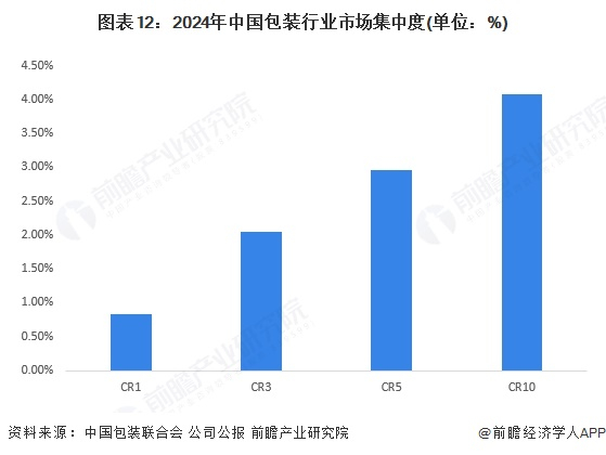 就国内市场格局来看,除少数龙头企业与外资企业外,中国包装产品生产企业多数规模较小、技术水平较低,缺乏自主创新能力,从而导致行业低端市场竞争的无序,产品主要以低档次、低附加值产品为主。目前,我国包装行业竞争格局十分分散,行业仍处于完全竞争的市场阶段。基于行业代表性企业2024年营业收入和市场规模,前瞻初步测算2024年我国包装行业CR10市场份额未超过5%。整体来看,包装行业企业竞争较为分散,行业龙头企业市场份额较低,行业集中度有待进一步提升。