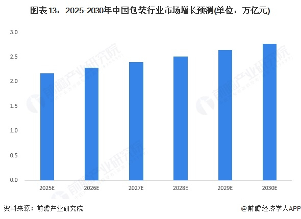 前瞻产业研究院结合产业增长趋势初步预测,2030年中国包装行业市场规模或将达到2.8万亿元。
