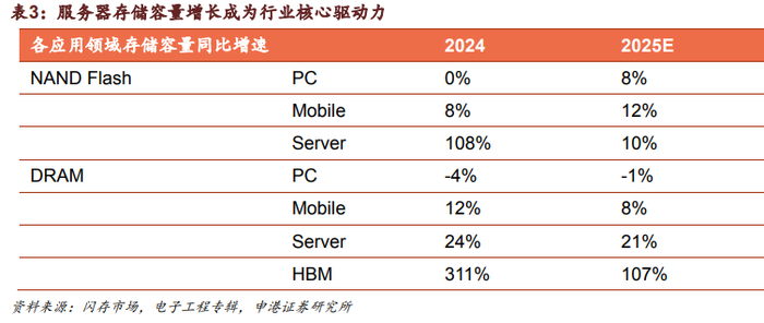 在DRAM主要供应商将逐渐收敛Server和PCDDR4产出、下游积极提前备货等因素影响下,预计Server与PCDDR4模组价格在25Q2将分别环比增长18-23%和13-18%,在25Q3将分别环比增长8%-13%和18%-23%。