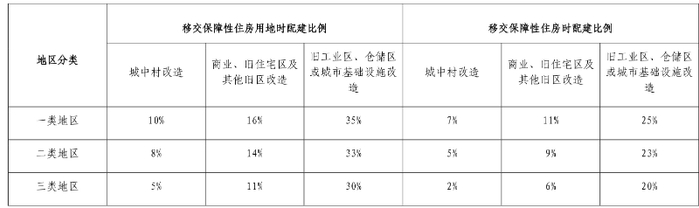 6、分类地区与改造类型结合:配建比例依据城市更新单元改造类型结合保障性住房配建空间范围图明确的分类地区确定。一、二、三类地区的保障性住房配建基准比例分别为20%、18%、15%。
