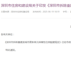 6月19日,深圳住建局正式印发《深圳市拆除重建类城市更新单元保障性住房配建规定》。