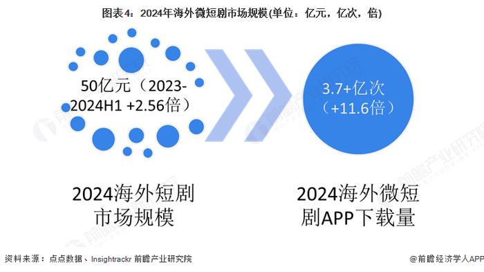 短剧App在海外也是巨大的蓝海市场,2024年,海外微短剧市场规模达到50亿元,从2023年12月到2024年6月,市场规模增长了2.56倍。海外微短剧APP的用户规模也在迅速扩张,2024年累计下载量超过3.7亿次,与2023年同期相比增长了11.6倍。这表明海外微短剧市场在2024年呈现爆发式增长,市场需求旺盛,发展潜力巨大。