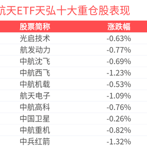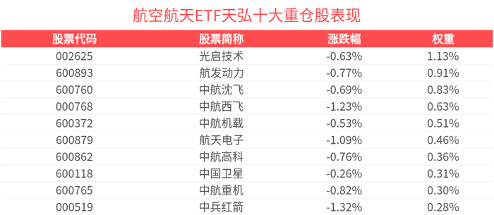 数据显示,截至2025年6月19日,国证航天航空行业指数(CN5082)前十大权重股分别为光启技术(002625)、中航沈飞(600760)、航发动力(600893)、中航西飞(000768)、中航机载(600372)、中航成飞(302132)、航天电子(600879)、中航高科(600862)、中国卫星(600118)、中航重机(600765),前十大权重股合计占比50.57%。