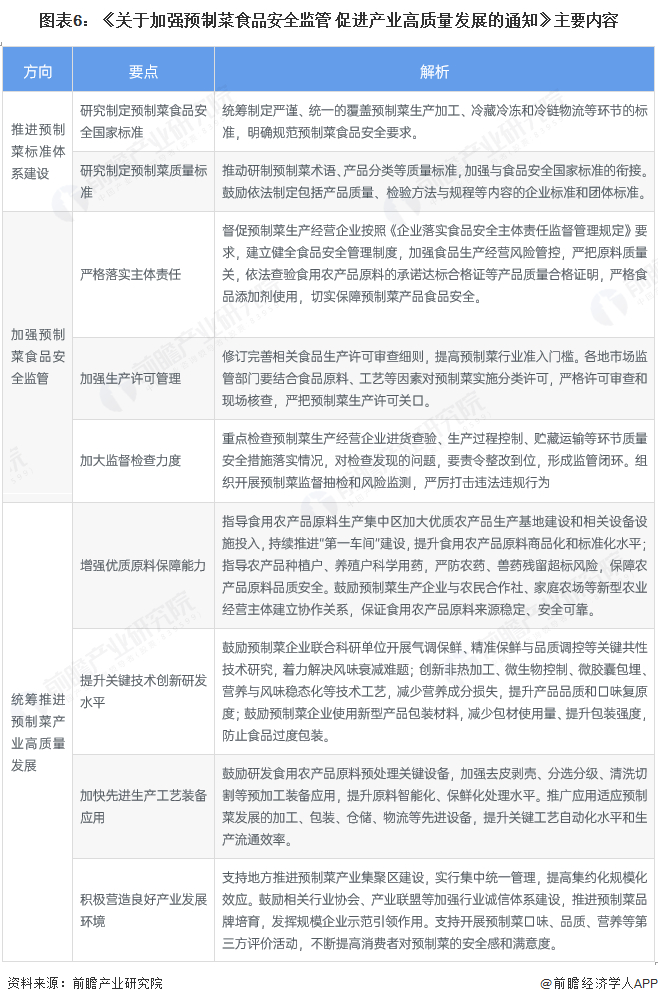 2024年3月,市场监管总局、教育部、工业和信息化部、农业农村部、商务部、国家卫生健康委联合发布《关于加强预制菜食品安全监管 促进产业高质量发展的通知》,明确规范预制菜范围,就促进预制菜产业高质量发展有关工作做出如下主要安排: