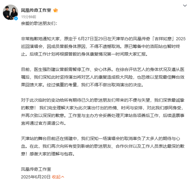 非常抱歉地通知大家,原定于6月27日至29日在天津举办的凤凰传奇「吉祥如意」2025巡回演唱会,因成员曾毅身体原因,不得不遗憾取消。原已筹备中的洛阳站也暂时终止。后续工作计划将根据曾毅的身体康复情况第一时间跟大家汇报。