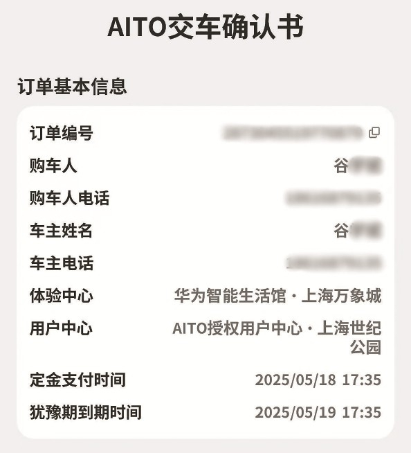 5月18日,谷先生通过手机应用程序AITO,支付1万元定金,订购了一辆问界M8新能源车。之后很快有汽车销售人员回电,与他确认交付方案。