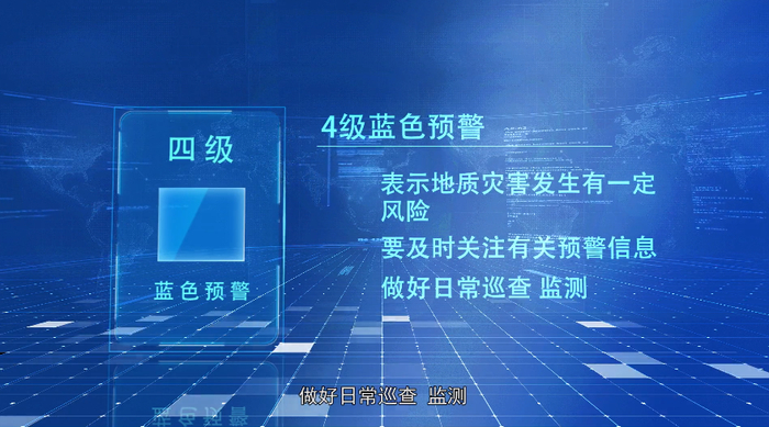 1.蓝色预警:关注当地气象和地质灾害预警信息。学习基本的地质灾害防范知识,了解家庭应急计划。