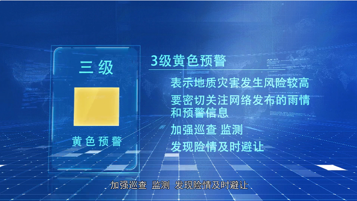 2.黄色预警:密切关注预警信息和天气变化,及时收听收看气象和地质灾害预警。减少外出,避免前往地质灾害易发区。
