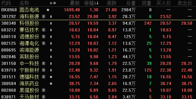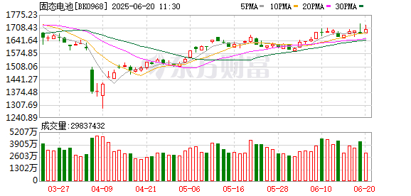 6月20日早盘,A股固态电池板块多股走高,海科新源、诺德股份、湘潭电化等个股涨停,科恒股份盘中涨停,午间收盘上涨19.59%,中一科技、德福科技、上海洗霸等涨幅在5%以上。