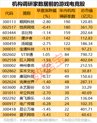 据证券时报·数据宝统计,A股中布局游戏电竞行业的上市公司共有53家。从机构关注度来看,24股今年以来获得机构调研,顺网科技、恺英网络、吉比特等6股调研家数居前,均在100家及以上。