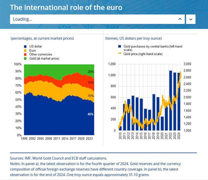 (左图绿色部分是黄金储备占比,深蓝色部分是美元储备占比)