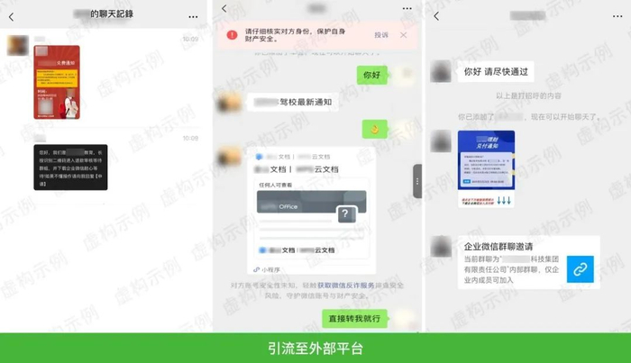 2.伪造通知引流:添加好友后,诈骗分子会通过图片、视频、收藏功能、在线云文档等形式发送虚假的“清退通知”,诱导受害人进入虚假在线网址或引流到微信外部平台与所谓的“客服”联系。