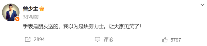6月13日,曾毅发文回应手表争议:“手表是朋友送的,我以为是块劳力士。让大家见笑了!”