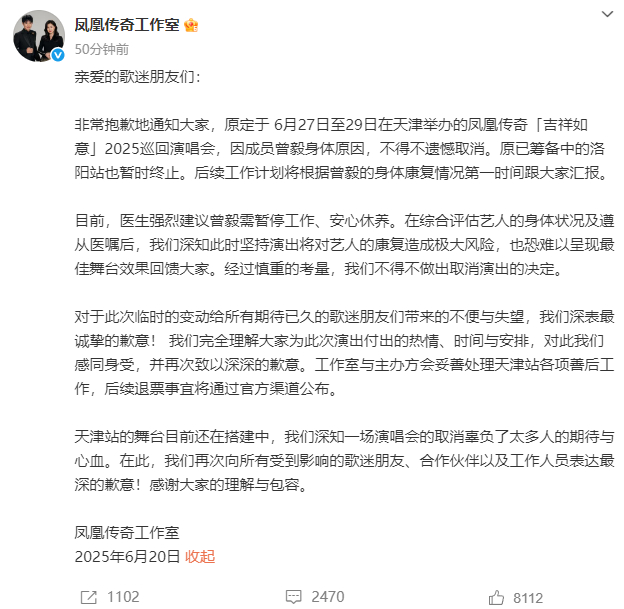 6月20日,@凤凰传奇工作室发布长文道歉:原定于6月27日至29日在天津举办的凤凰传奇“吉祥如意”2025巡回演唱会,因成员曾毅身体原因,不得不遗憾取消,原已筹备中的洛阳站也暂时中止。