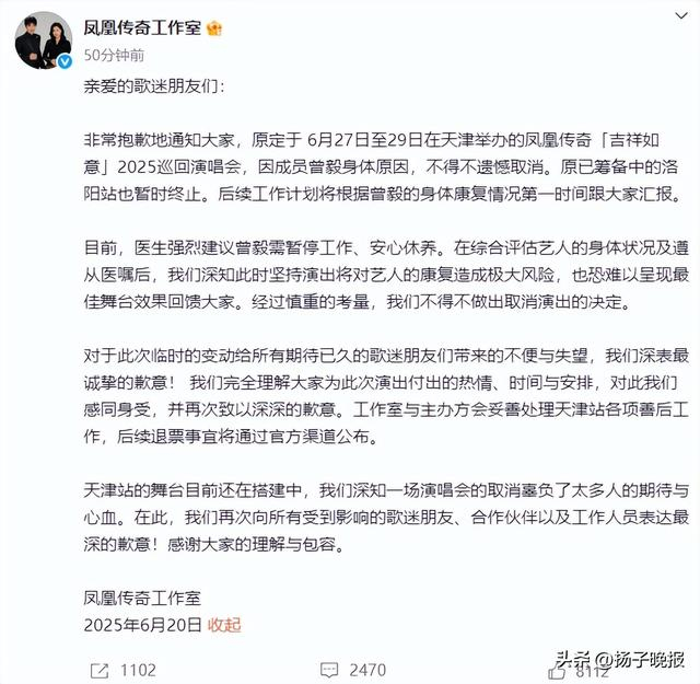 6月20日,@凤凰传奇工作室发布长文道歉:原定于6月27日至29日在天津举办的凤凰传奇“吉祥如意”2025巡回演唱会,因成员曾毅身体原因,不得不遗憾取消,原已筹备中的洛阳站也暂时中止。