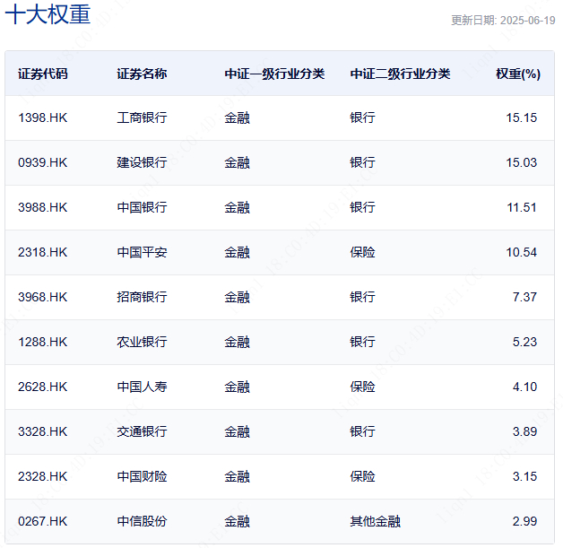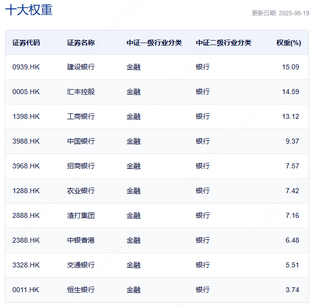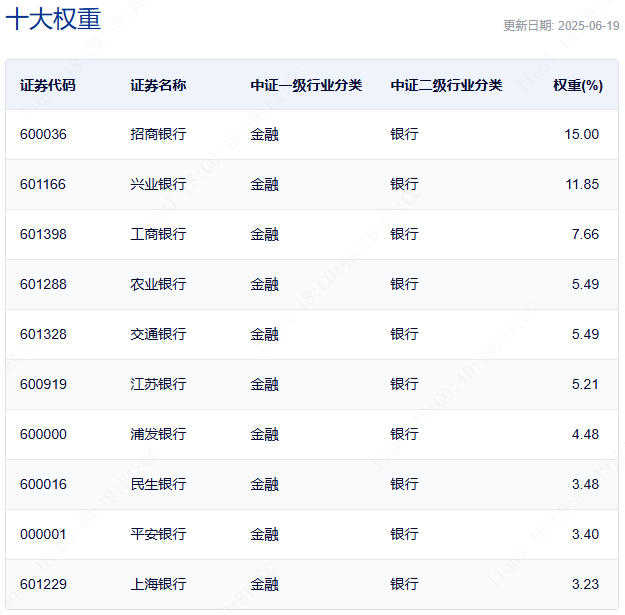 中证银行指数的成分股是清一色的银行股,前十大的集中度是65%。