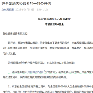 继闯入外卖赛道后,6月18日,京东发布《致全体酒店经营者的一封公开信》,再加码酒旅赛道。