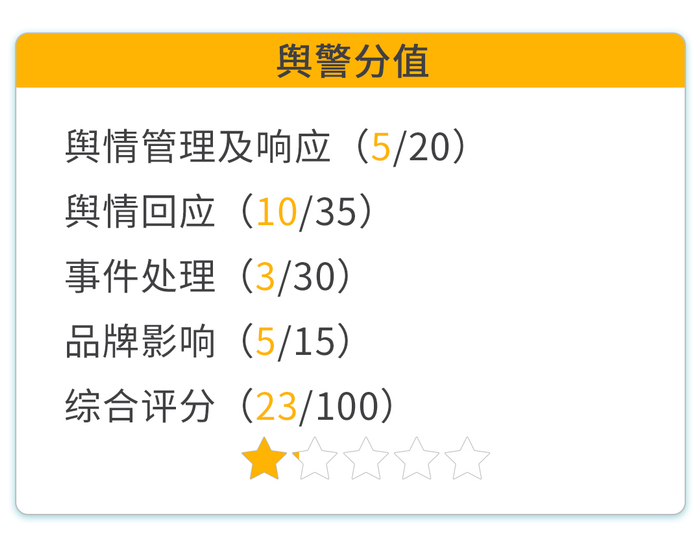 为此,南财·21消费新闻部综合企业在舆情预警与回应中涉及的公开操作维度,形成量化评分机制——具体而言,包含舆情管理及响应、舆情回应、事件处理、品牌影响四个一级指标和预防机制、回应直接度、信息透明度、处理长效性等14个二级指标,按照百分制根据重要性对不同指标赋值并打分,并以《消费舆警指数》对企业的应对速度、态度与有效度进行分析评价,为企业品牌管理与消费者的品牌认知提供参考。