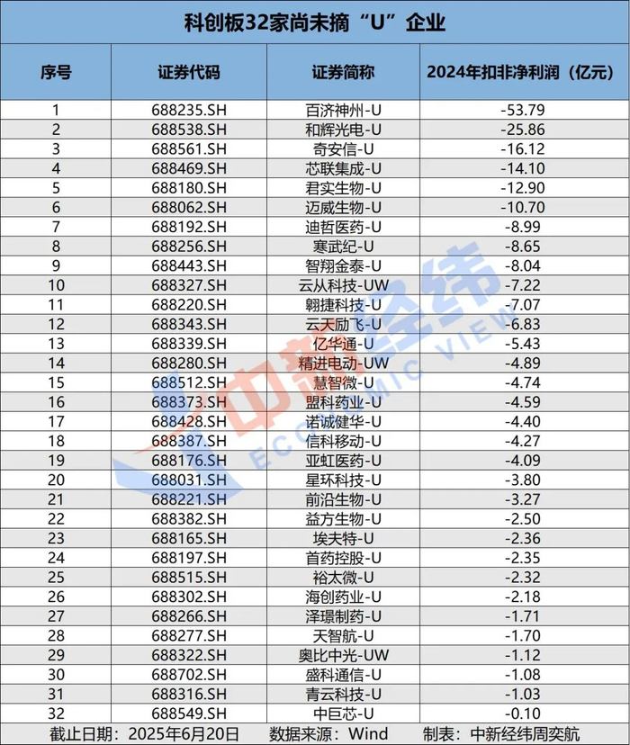 “V观财报”梳理发现,截至目前,共有32家科创板企业自上市以来的扣非净利润均为负,包括百济神州-U、君实生物-U、寒武纪-U、和辉光电-U等。而根据《科创成长层指引》要求,上述32家企业预计将被纳入科创成长层。