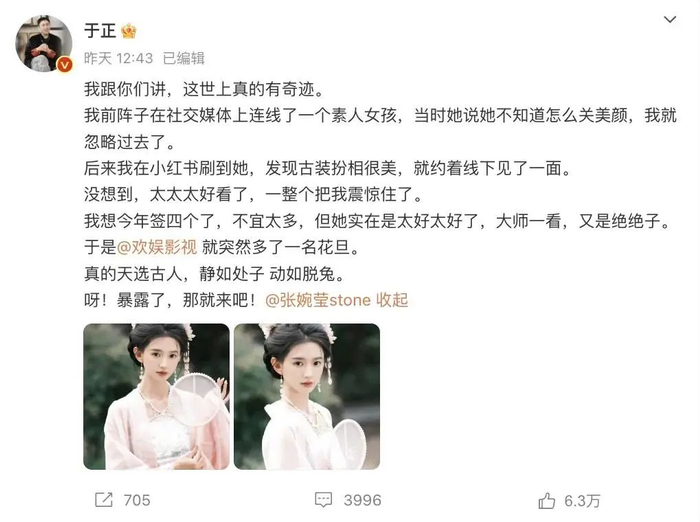 2024年12月,于正晒照官宣新签约素人美女张婉莹,大赞对方外貌“真的天选古人,静如处子动如脱兔”。随即有网友发现该女生曾是一名河南某高校教师。
