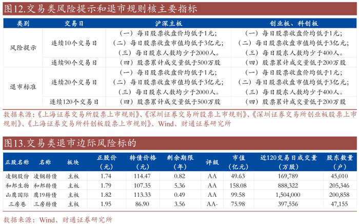 交易类风险提示和退市规则主要对收盘价、市值、股东人数和累计成交量有要求,沪深主板与科创板、科创板要求细则上略有差别。截至2025年6月17日,存续转债正股均未触发交易类风险提示和退市条件,但需关注面值边际风险:鹰19、凌钢、三房及和邦转债正股股价介于1-2元。市值、股东人数和成交量角度暂无风险,目前转债市场市值最小标的为飞鹿股份(市值14.42亿元)、股东数量最少的是星球石墨(3934户)、近120个交易日成交量最少的是嘉益股份(10613万股)。