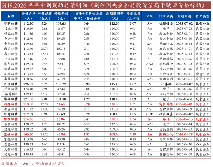 目前市场上2026年6月30日前到期的转债共计53只,合计规模883.73亿元,其中19只转债当下的转股价值高于到期赎回价,合计规模47.69亿元,投资者大概率通过转股方式退出。在剩余34只转债中,国央企转债共计7只,合计规模700亿元(包含浦发500亿)。剔除上述转债后,明年年中到期的转债共27只,合计规模283.27亿元。