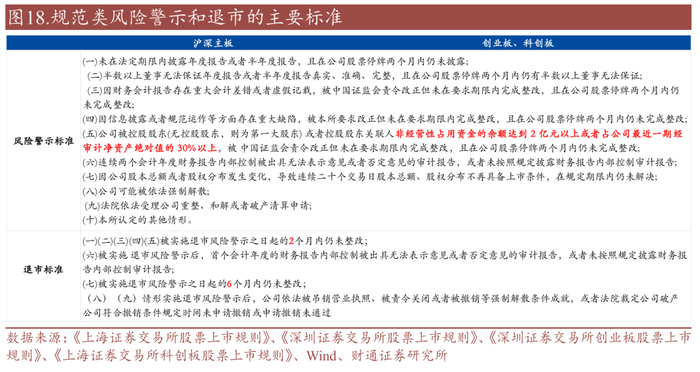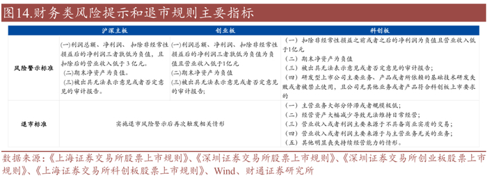 财务类风险警示及退市标准中,公司最近一个会计年度经审计的利润总额、净利润、 扣除非经常性损益后的净利润三者孰低为负值,且扣除后的营业收入低于 3 亿元(沪深主板3亿元,创业板/科创板1亿元)或期末净资产为负以及若有年报被出具无法表示意见或者否定意见的审计报告则会被风险警示,连续2年将实施退市。此外科创板对于研发型上市企业的风险提示要求和退市标准与沪深主板和创业板细则略有不同。
