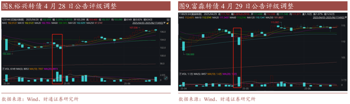 剔除频繁下调评级的东时、普利、中装转债,2025年目前共有5只转债不定期下调评级,8只转债定期下调评级,其中6只从A+下调为A(瑞科、雪榕、华宏、富淼、山石、蒙泰),2只从AA-下调为A+(裕兴、国城),2只从AA下调为AA-(金能、闻泰),1只从A下调至A-(冠中)、1只从A-下调为BBB+(宏图),1只从BBB+下调为BBB-(塞力)。评级下调转债中公募2025Q1持仓占比较高的有华宏、裕兴、富淼、国城、闻泰,评级相对较高的是裕兴、金能、国城和闻泰。