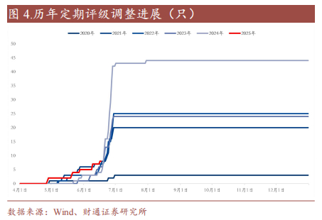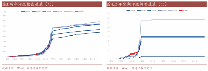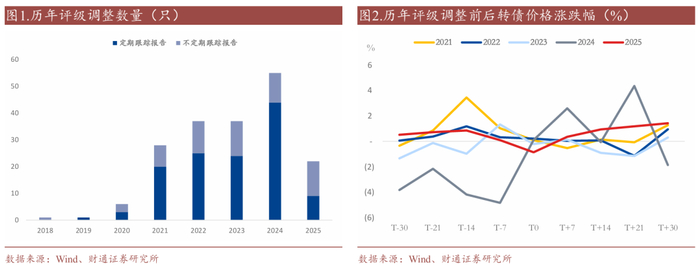 2025年评级披露速度较往年未有明显差别,定期评级下调数量略高于往年同期。历年转债评级披露和调整高峰主要在6月中下旬,截至2025年6月17日,转债市场2025年共有222只转债披露评级(包含不定期和定期评级),略高于2024年212只,略低于2023年317只。2025年定期评级下调数量略高于同期,目前共有8只转债下调评级,高于同时期2024年下调的4只和2023年6只。
